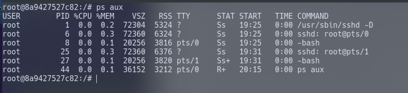 Let's list the processes running in our Docker container using ps aux It's important to note that we only have 6 processes running. This difference is a great indicator that we're in a container.
