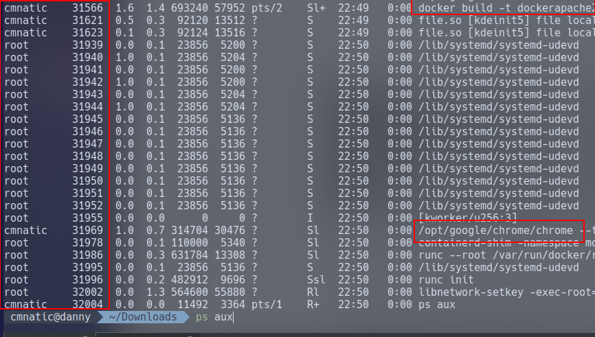 Namespaces are how containerization is achieved! Processes can only "see" the process that is in the same namespace - no conflicts in theory. Take Docker for example, every new container will be running as a new namespace, although the container may be running multiple applications (and in turn, processes). [Example] we can see system user the process is running as then the processes number. There are a few more columns that aren't worth explaining for this task. But notice in the last column, the command that is running. I've highlighted a Docker command running, and an instance of Google Chrome running. You can see I have a considerable amount of processes running.