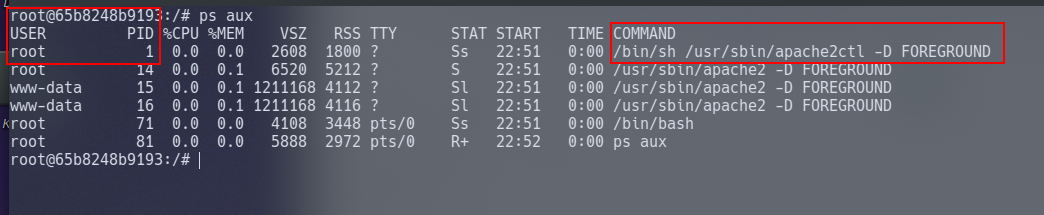 Containers, due to their isolated nature, will often have very little processes running in comparison to something such as a virtual machine. We can simply use ps aux to print the running processes. Note in the screenshot below that there are very few processes running?