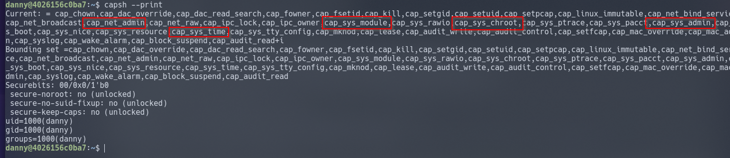 We can use a system package such as "libcap2-bin"'s capsh To check the privileges of the container, we run the below command inside a docker container shell