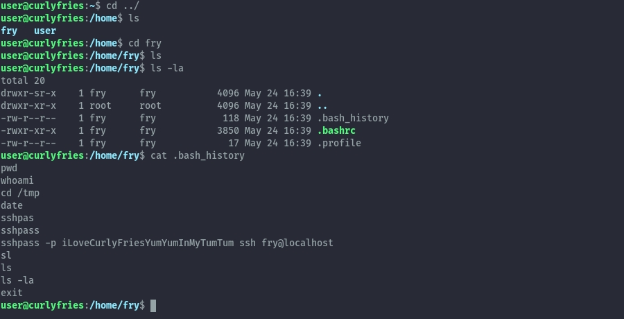 Looking around, we find that in fry’s home folder we can read the bash_history file. This gives us their password.
