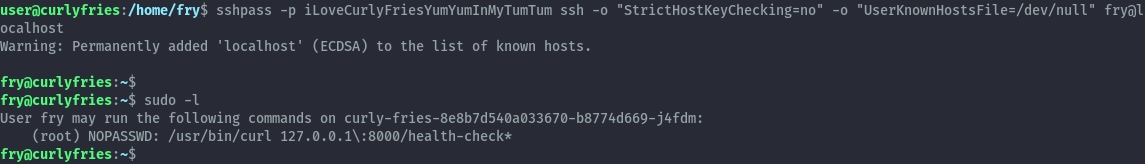 Our user has sudo privileges to run curl impersonating the user fry, however this configuration is not vulnerable to abuse.