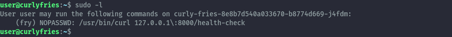 Our user has sudo privileges to run curl impersonating the user fry, however this configuration is not vulnerable to abuse.