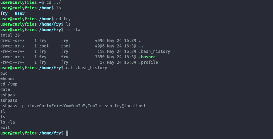 Looking around, we find that in fry’s home folder we can read the bash_history file. This gives us their password.